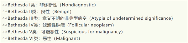 答:细胞病理学诊断报告一般采用TBSRTC(The Bethesda System for Reporting Thyroid Cytopathology)报告系统,在此报告系统中,细胞学诊断分为六级:I级,不能诊断/不满意;Ⅱ级,良性;Ⅲ级,意义不明的非典型细胞/意义不明的滤泡性病变;Ⅳ级,滤泡性肿瘤/可疑滤泡性肿瘤;Ⅴ级,可疑恶性和Ⅵ级,恶性。
