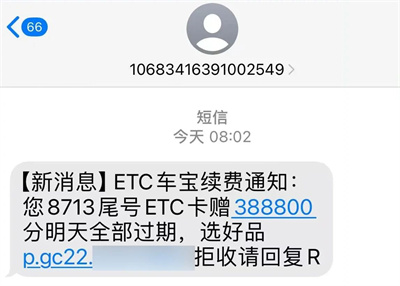 骗子冒充ETC中心等机构向广大车主发送含有钓鱼链接的诈骗短信以“ETC认证失效、ETC未认证、ETC需更新、ETC需续签、ETC自动抬杆失效、ETC故障”等为由,诱导车主点击进入钓鱼网站,填写银行卡、密码等个人信息从而诈骗钱财。