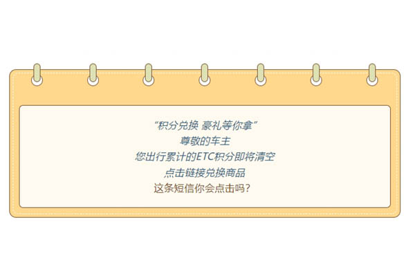 1、ETC发行机构和银行均不会以短信方式要求客户在链接中填写个人信息。切勿点击陌生链接,请务必向官方客服核实确认后,通过官方渠道执行相关操作。