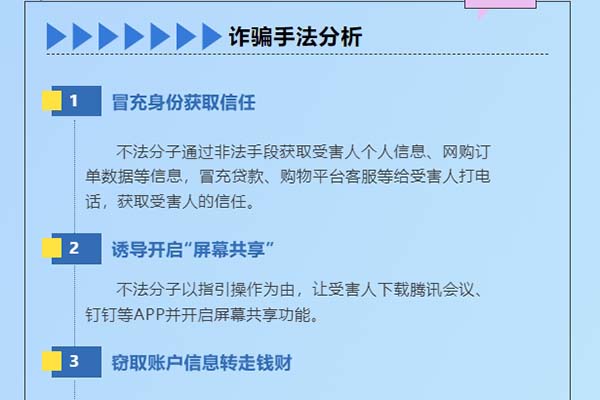 不法分子哄骗受害人转账,通过屏幕共享窃取受害人的银行账户密码短信验证码等,在受害人毫不知觉的情况下转走钱财。