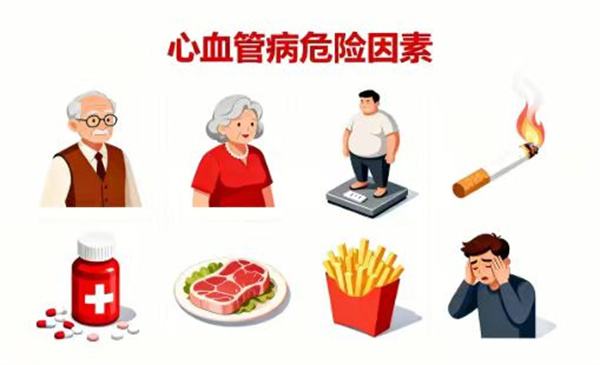 年龄(男>55岁,女>65岁)、吸烟或被动吸烟、超重肥胖、活动量下降、合并基础病(高血压、血脂异常、糖尿病、慢性肾脏病、高尿酸血症、高同型半胱氨酸血症)、长期失眠/焦虑/抑郁状态、饮食结构不合理(摄盐量高,摄入较多食用油,摄入较多畜肉如猪肉等)、早发心血管疾病家族史等。