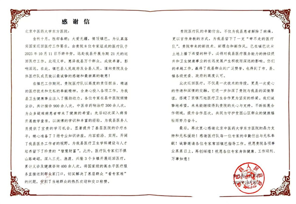 2025年10月30日,北京中医药大学东方医院国家中医医疗队在镇巴县中医院圆满完成最后一场临床教学查房,为期21天的巡回医疗工作正式落下帷幕。镇巴县人民政府特致感谢信,向国家中医医疗队的辛勤付出致以崇高敬意,向北京中医药大学东方医院助力乡村振兴的担当表示诚挚感谢。信中写道:“北京中医药大学东方医院国家中医医疗队的辛勤付出,不仅为镇巴县患者解除了病痛,更以言传身教的方式,为镇巴县留下了一支‘带不走的医疗队’。东方医院带来的新技术、新理念和新作风,已在镇巴这片土地上播下希望的种子,必将对镇巴县医疗服务能力的持续提升和卫生健康事业的长远发展产生积极而深远的影响。国家中医医疗队的卓越工作,赢得了镇巴县群众的广泛赞誉,也得到了市、县、镇各级党委、政府的高度认可。”