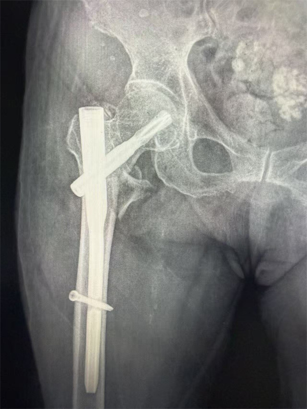 手术当日,姜丽带领的麻醉团队摒弃传统全麻方案,采用“髂筋膜阻滞及股外侧皮神经阻滞+中度镇静”的精准麻醉方式,最大限度减少对老人心肺功能的影响。术中持续监测指标,确保生命体征稳定。B超引导(可视化)的神经阻滞,精准定位、精准给药,不仅使副作用减少,更能让镇痛的时间延长到术后。手术由温鑫柱和骨科李观清医生共同完成,仅用时40分钟便完成骨折复位与固定,术中出血不足50ml,创伤小、恢复快的优势尽显。