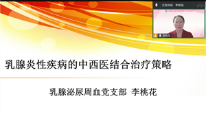 支部宣传委员曹刚主持讲堂环节,李桃花支部书记分享了题为《乳腺炎性疾病的中西医结合治疗策略》的讲座。首先分享乳腺科经北京市中医药管理局批复,成立了“乳腺炎性疾病诊疗中心”,并开展乳腺炎专病门诊等4个专病门诊,科室突出专病建设。随后分享哺乳期乳腺炎、肉芽肿性乳腺炎、浆细胞性乳腺炎等常见乳腺炎性疾病的中西医结合治疗策略,提出分期论治、内外结合、中西并用的治疗理念,并介绍了乳腺专科特色治疗手法、特色用方等,以生动的临床病例,将专科知识深入浅出的传播给与会人员。